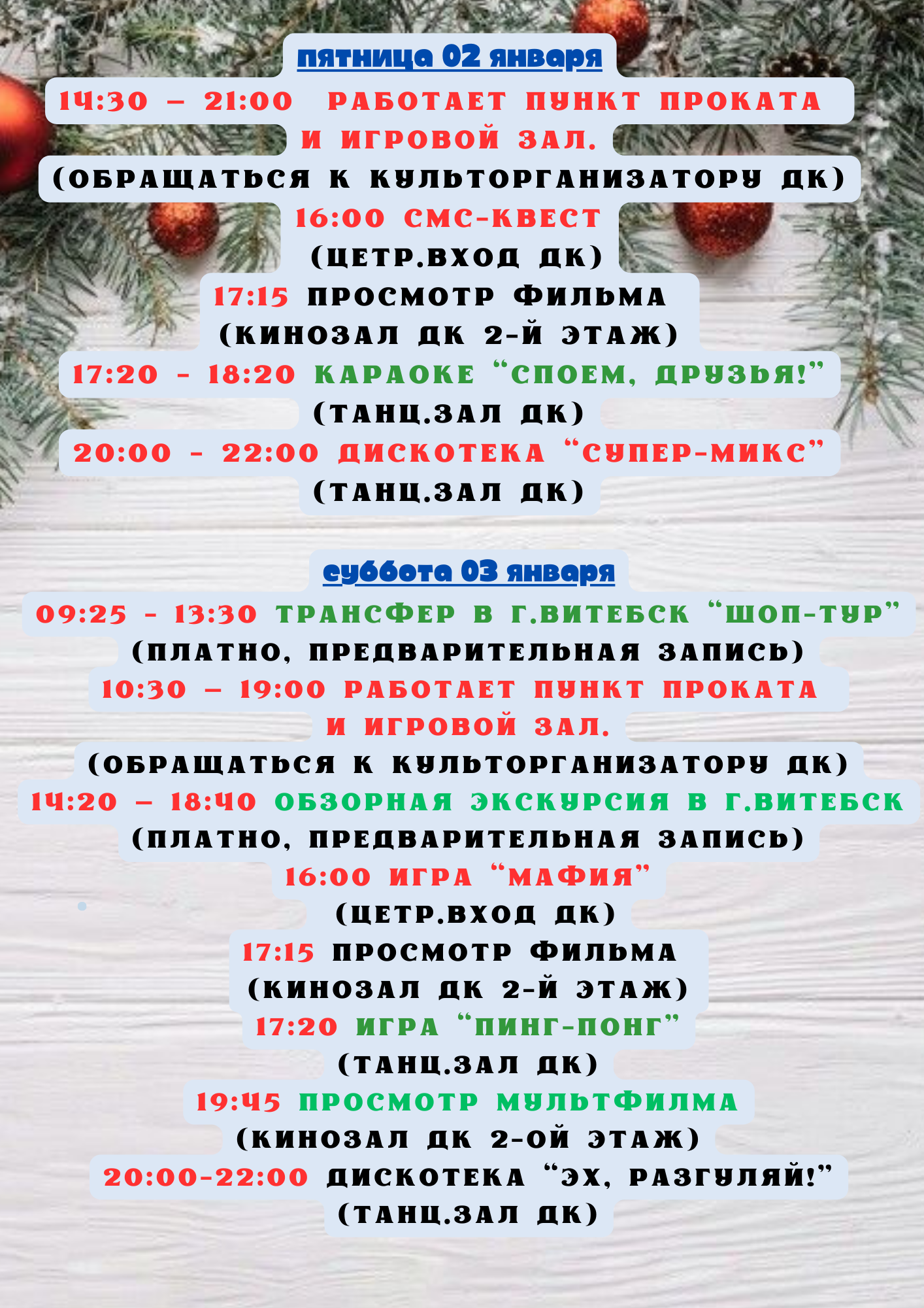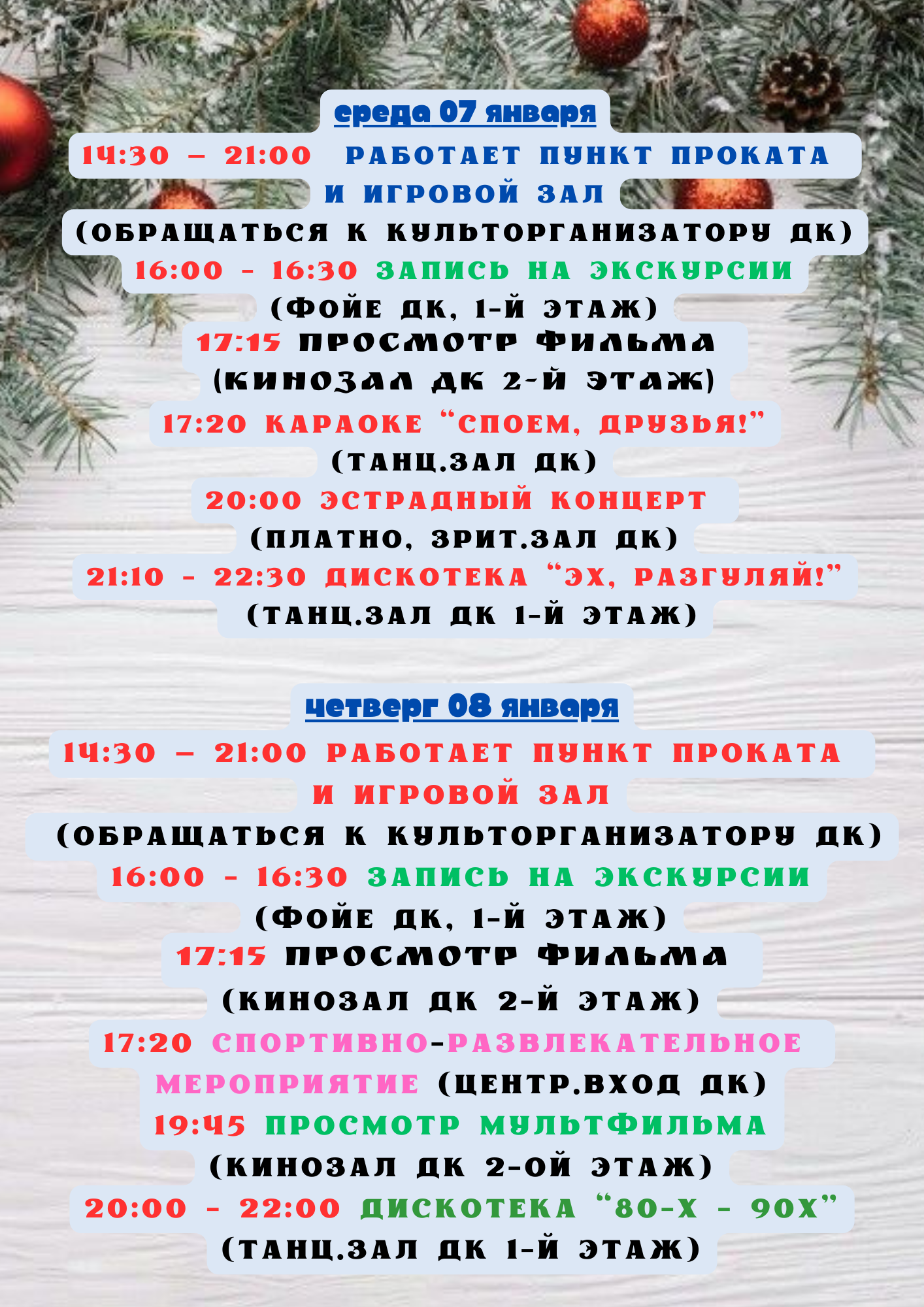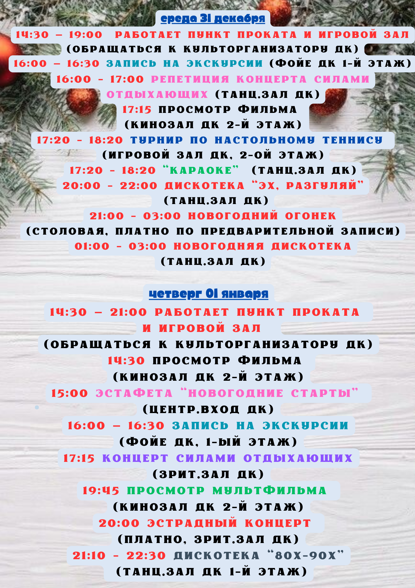В новогоднюю ночь с 01:00 до 03:00 для отдыхающих в танцевальном зале дворца культуры будет проходить праздничная дискотека «Привет, новый год!». Вход свободный.