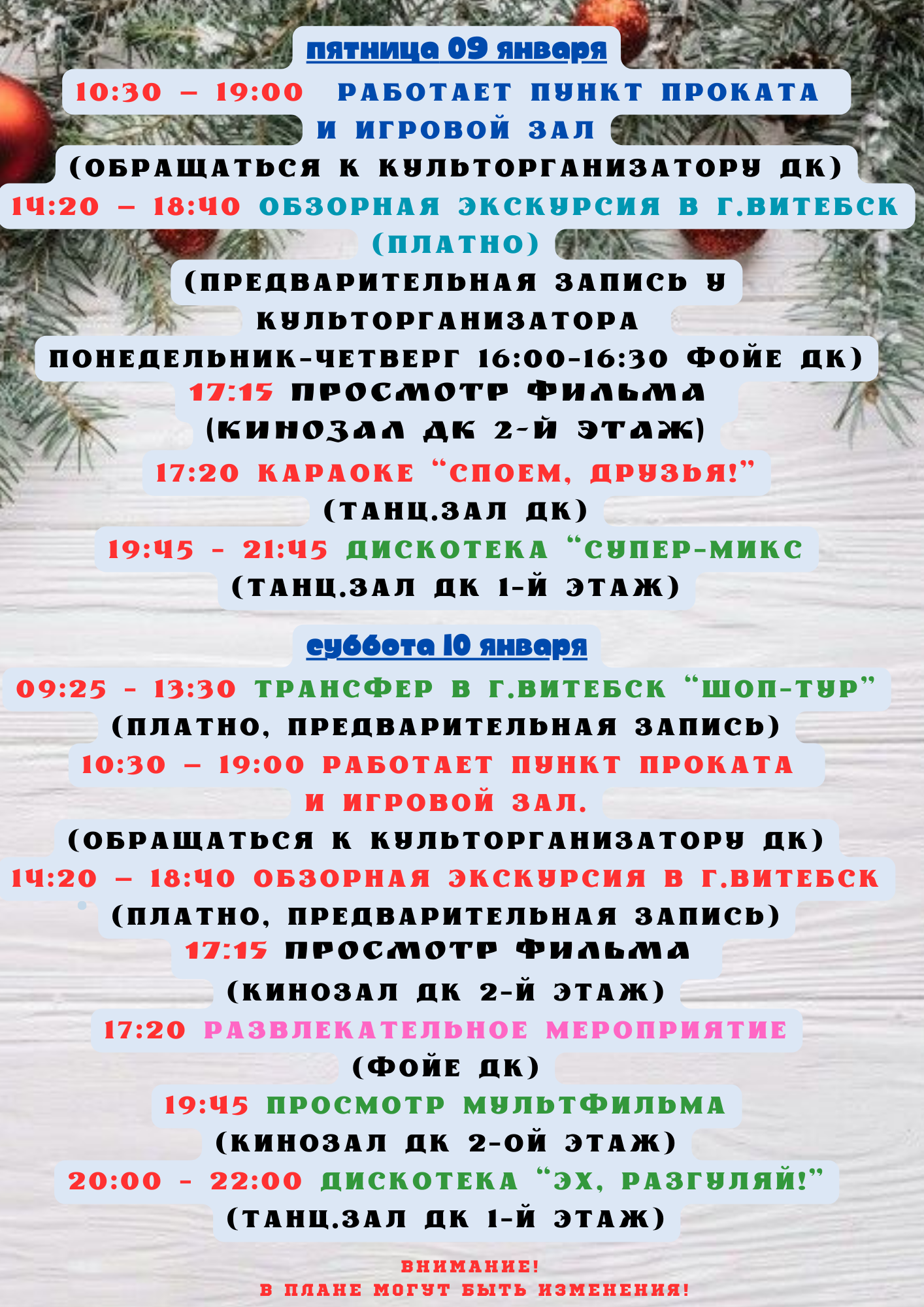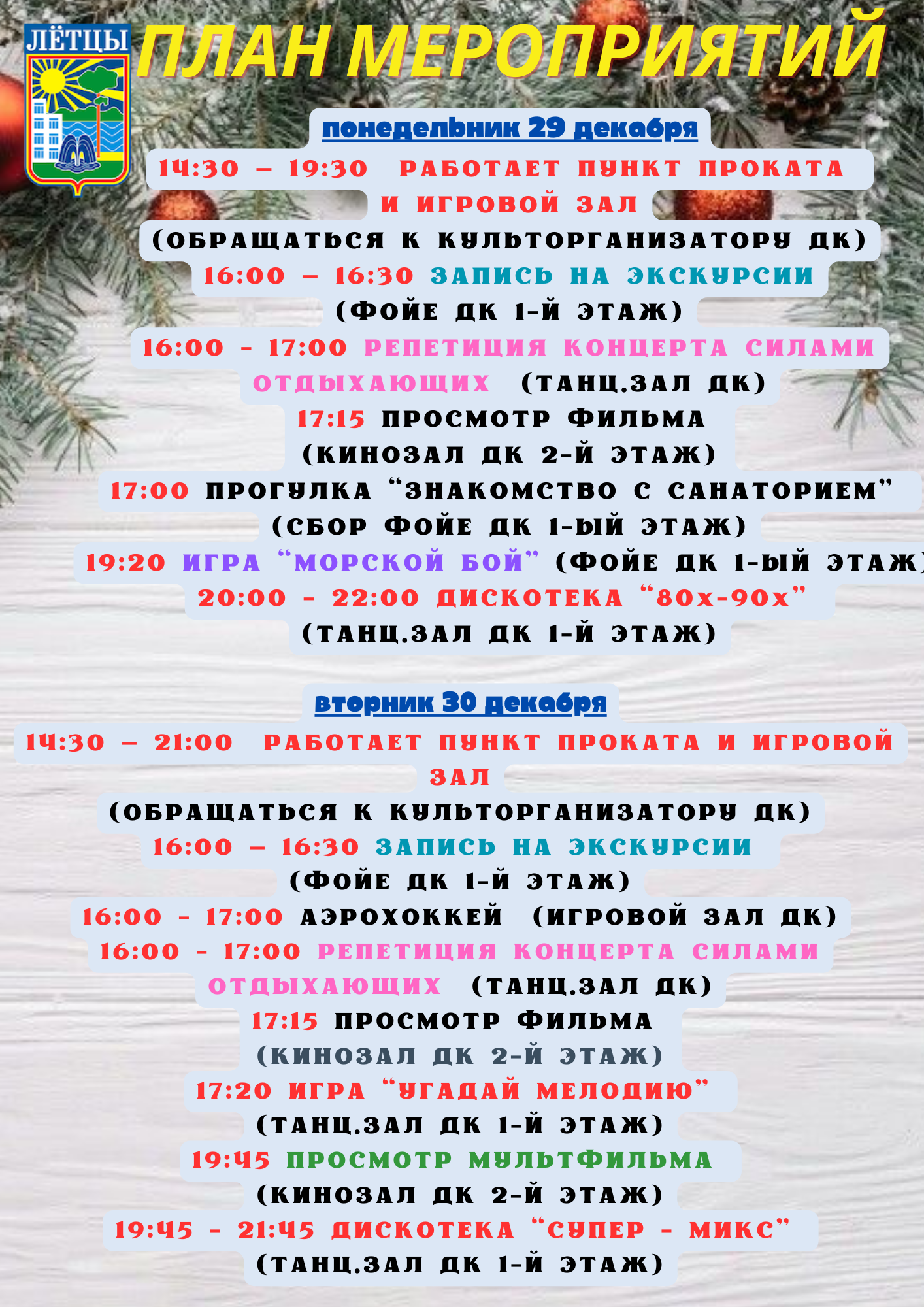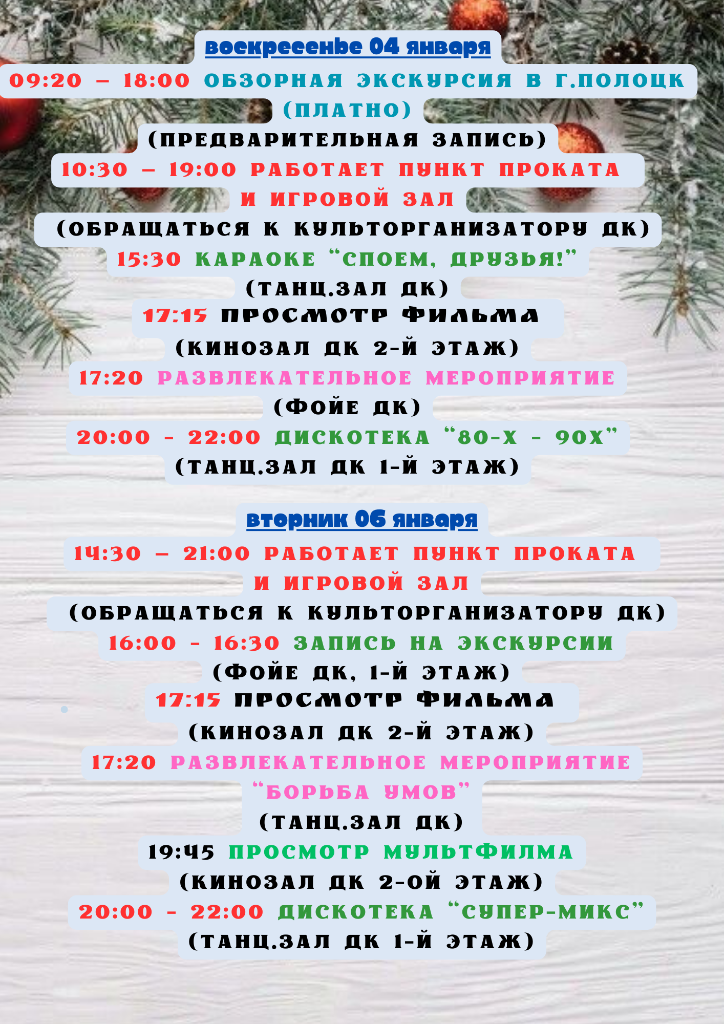 В новогоднюю ночь с 01:00 до 03:00 для отдыхающих в танцевальном зале дворца культуры будет проходить праздничная дискотека «Привет, новый год!». Вход свободный.